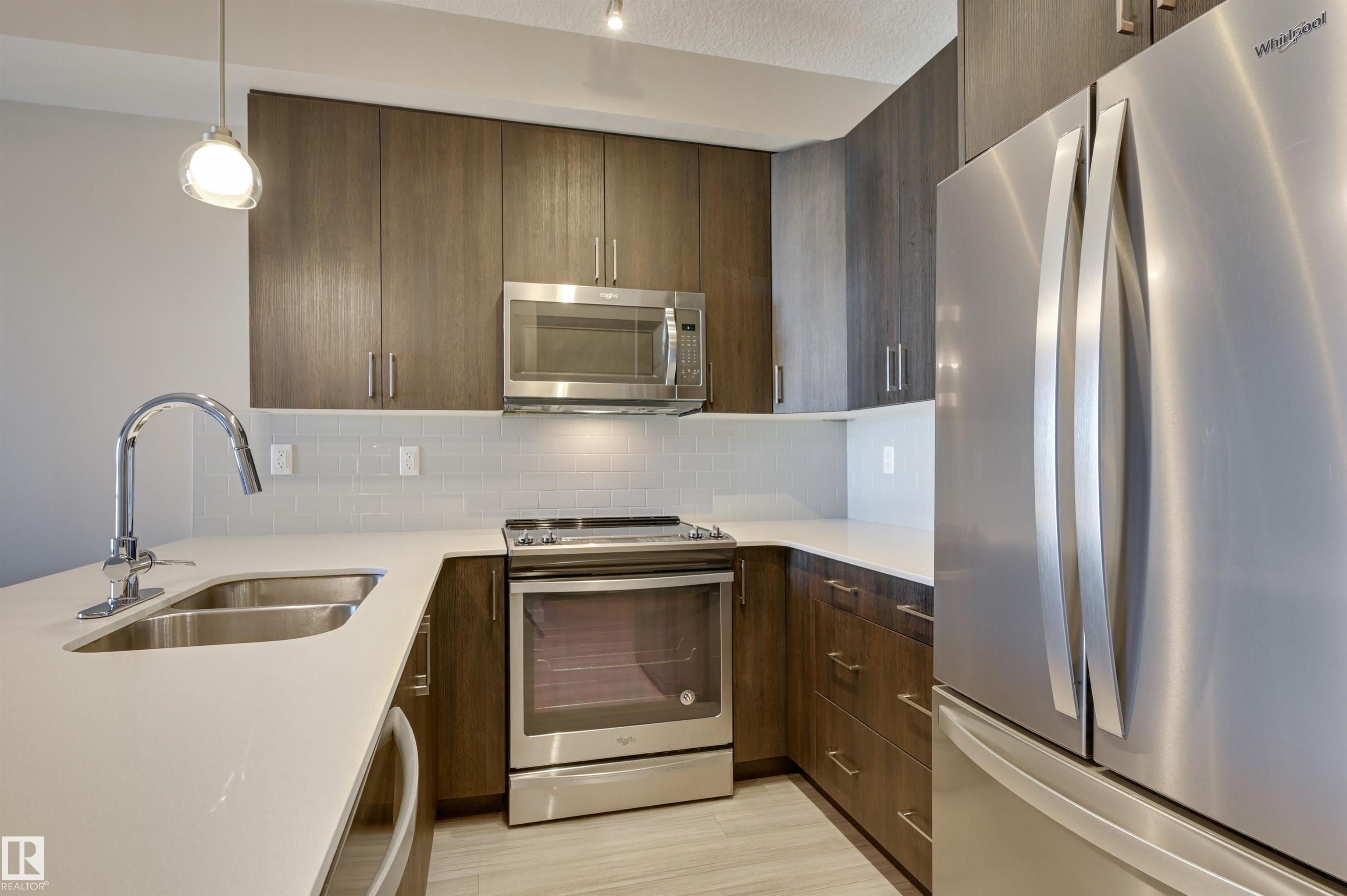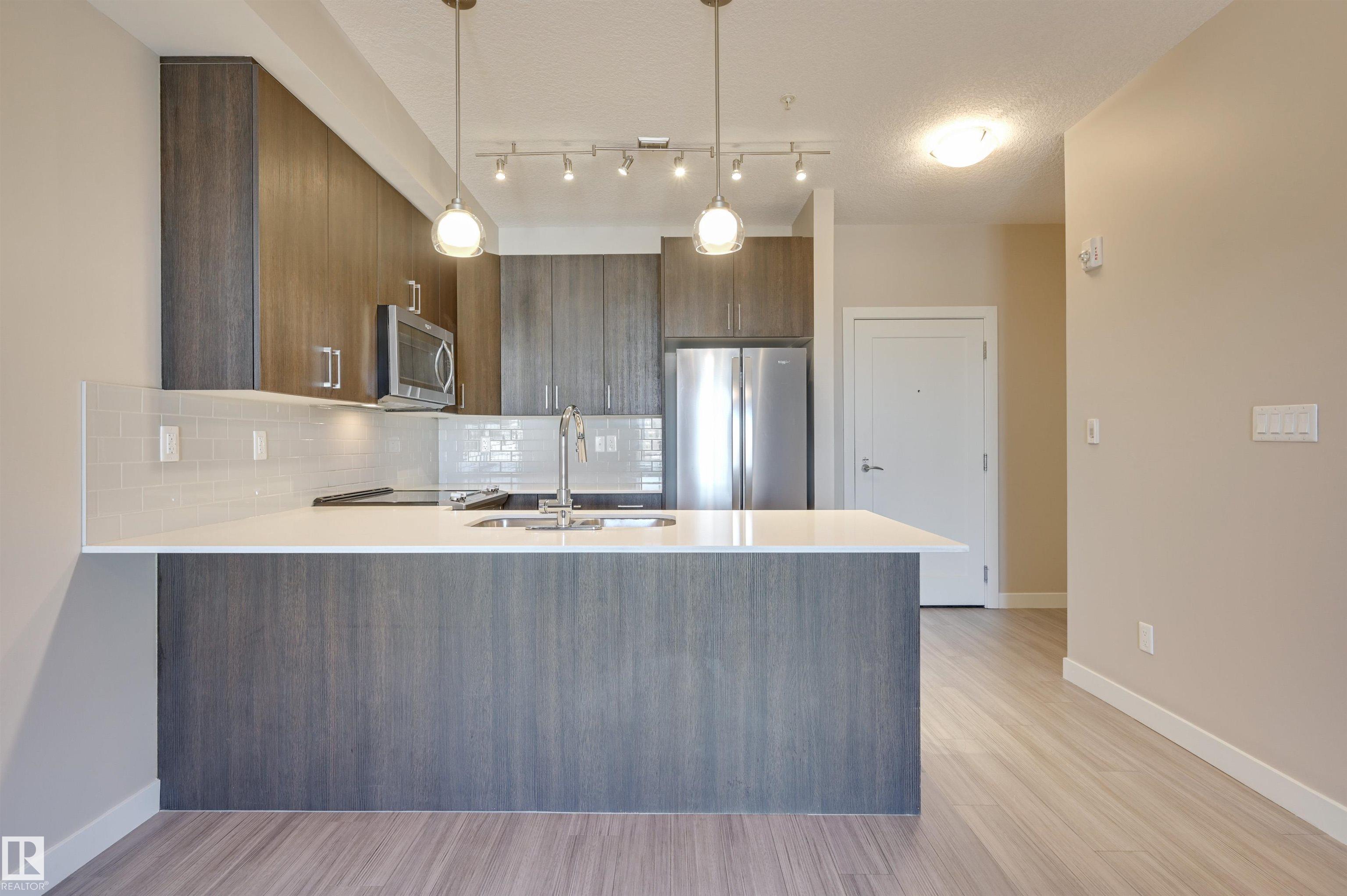Welcome home to this spacious 708 sq.ft. modern 2 bedroom condo in THE RIDGE located in the heart of DEVON within walking distance to schools, parks, groceries, restaurants, outdoor pool, arena and river valley walking/biking trails. This unit has an open concept floor plan with 9' ceilings offering premium finishings throughout. The kitchen has an eating island, quartz countertops, espresso color cabinetry, with soft close and stainless steel appliances. The bedrooms are at opposite ends of the living a...